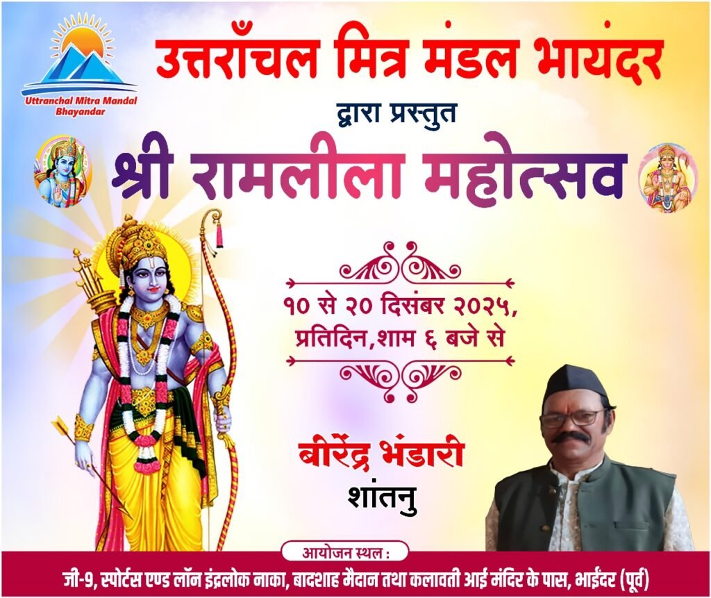 मुंबई: भाईंदर (पूर्व) में इस साल श्री रामलीला महोत्सव–2025 का शानदार आयोजन होने जा रहा है। उत्तराँचल मित्र मंडल, भाईंदर द्वारा आयोजित यह दिव्य कार्यक्रम 10 दिसंबर से 20 दिसंबर 2025 तक चलेगा। हर दिन शाम 6 बजे से जी–9 स्पोर्ट्स एंड लॉन ग्राउंड, इंद्रलोक नाका, बादशाह मैदान, कलावती आई मंदिर के पास यह रामलीला मंचित की जाएगी। आयोजकों का कहना है कि इस बार रामलीला पहले से कहीं ज्यादा भव्य, मनोरंजक और आध्यात्मिक अनुभव प्रदान करने वाली होगी।