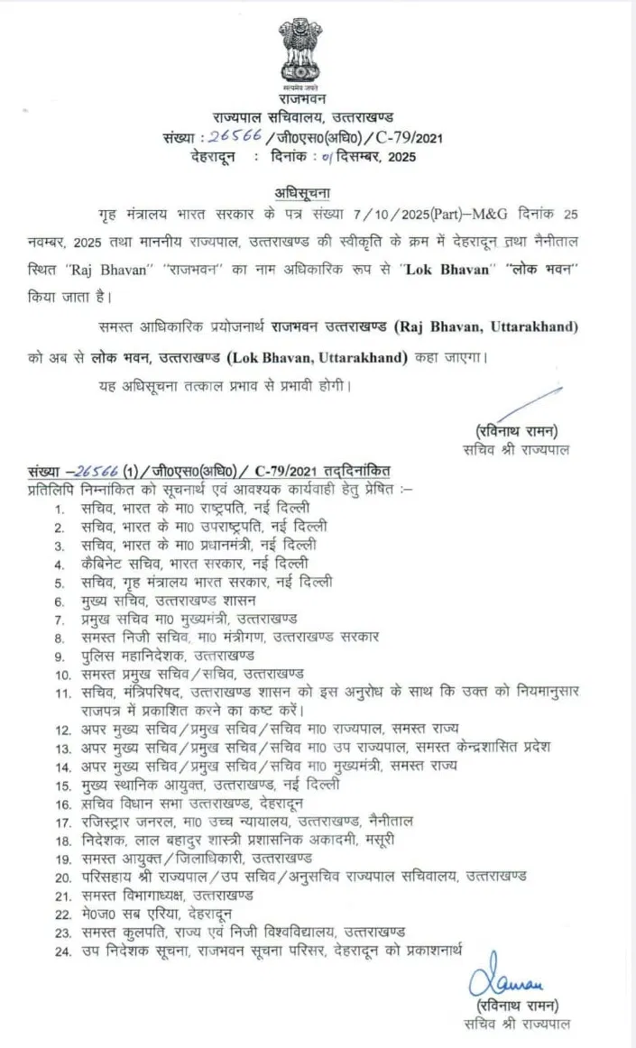 उत्तराखंड उत्तराखंड: देहरादून और नैनीताल में राजभवन का नाम बदलकर अब ‘लोक भवन’ रखा गया samvaad editor December 1, 2025 देहारादून: उत्तराखंड सरकार ने ऐतिहासिक निर्णय लिया है। अब देहरादून और नैनीताल स्थित राजभवन को “लोक भवन” के नाम से जाना जाएगा। राजभवन सचिवालय की ओर से इसका आधिकारिक आदेश जारी कर दिया गया है। Continue Reading Previous: रिटायर्ड एयरफोर्स कर्मी की हत्या का सनसनीखेज खुलासा: बेटे ने अपने दोस्तों के साथ मिलकर पिता को मौत के घाट उताराNext: मुख्यमंत्री धामी का हरिद्वार में स्वागत, किसानों ने फूलों और गन्ना भेंट कर किया सम्मान Leave a Reply Cancel replyYour email address will not be published. Required fields are marked *Comment * Name * Email * Website Save my name, email, and website in this browser for the next time I comment. Related Stories उत्तराखंड: सुरसिंहधार नर्सिंग कॉलेज को मिला पी.जी. कॉलेज का दर्जा 1 min read उत्तराखंड उत्तराखंड: सुरसिंहधार नर्सिंग कॉलेज को मिला पी.जी. कॉलेज का दर्जा December 2, 2025 धर्मेंद्र की अस्थियां हरिद्वार पहुंचीं, वीआईपी घाट पर होगा शांतिपूर्ण विसर्जन 1 min read उत्तराखंड धर्मेंद्र की अस्थियां हरिद्वार पहुंचीं, वीआईपी घाट पर होगा शांतिपूर्ण विसर्जन December 2, 2025 उत्तराखंड: मेधावी छात्रों के लिए भारत दर्शन यात्रा-2025, द हंस फाउंडेशन के मार्गदर्शन से बनी यादगार 1 min read उत्तराखंड उत्तराखंड: मेधावी छात्रों के लिए भारत दर्शन यात्रा-2025, द हंस फाउंडेशन के मार्गदर्शन से बनी यादगार December 2, 2025